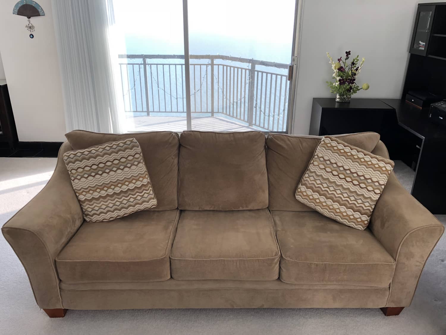 It's described as being in excellent condition and is actually part of a three-piece set that comes with the sofa, an accent chair, and a storage ottoman.